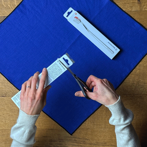 Pour notre version, nous avons choisi un carré de lin de 40 x 40 cm, parfait pour emballer 2 brosses à dents Berninox. Le même pliage furoshiki fonctionne aussi pour 1 brosse à dents ou un starter pack, en adaptant simplement le centrage et le serrage du nœud.