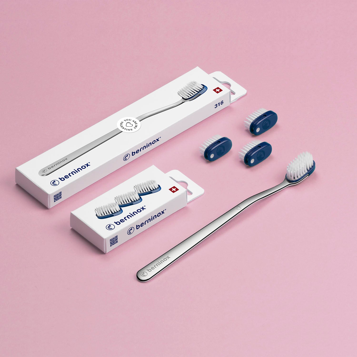 Udviklet og fremstillet i Schweiz i samarbejde med tandeksperter kombinerer Berninox-tandbørsten et holdbart håndtag i kirurgisk stål 316L med børstehoveder i genanvendt plastik udstyret med filamente af nyeste generation for en blid og effektiv rengøring. Designet til fejlfri daglig hygiejne kan den tåle opvaskemaskine og kan steriliseres med damp.