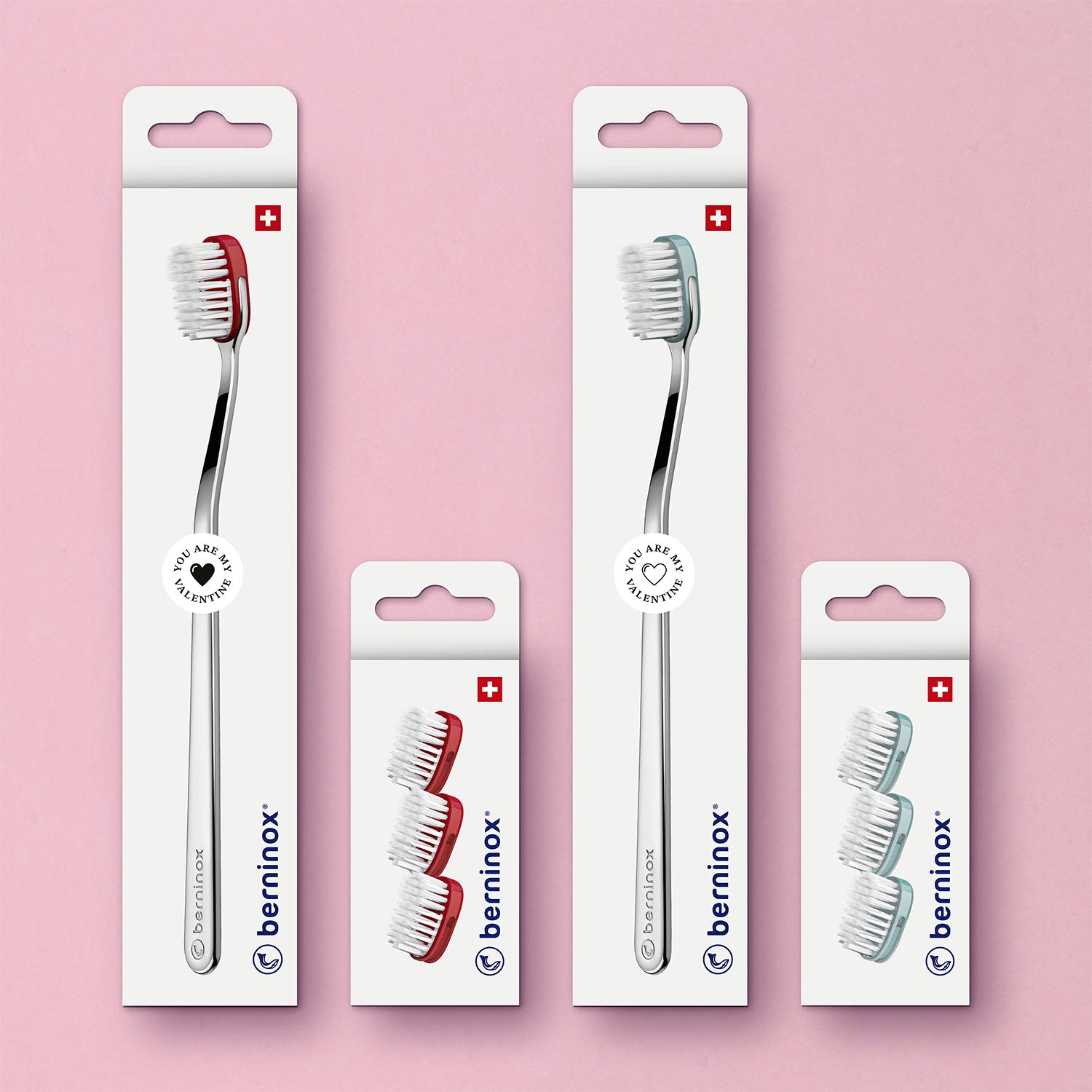 L'essentiel pour deux: le Double Starter Pack Berninox réunit deux brosses à dents et deux paquets de recharges, pensées pour prendre soin de deux sourires, matin et soir.