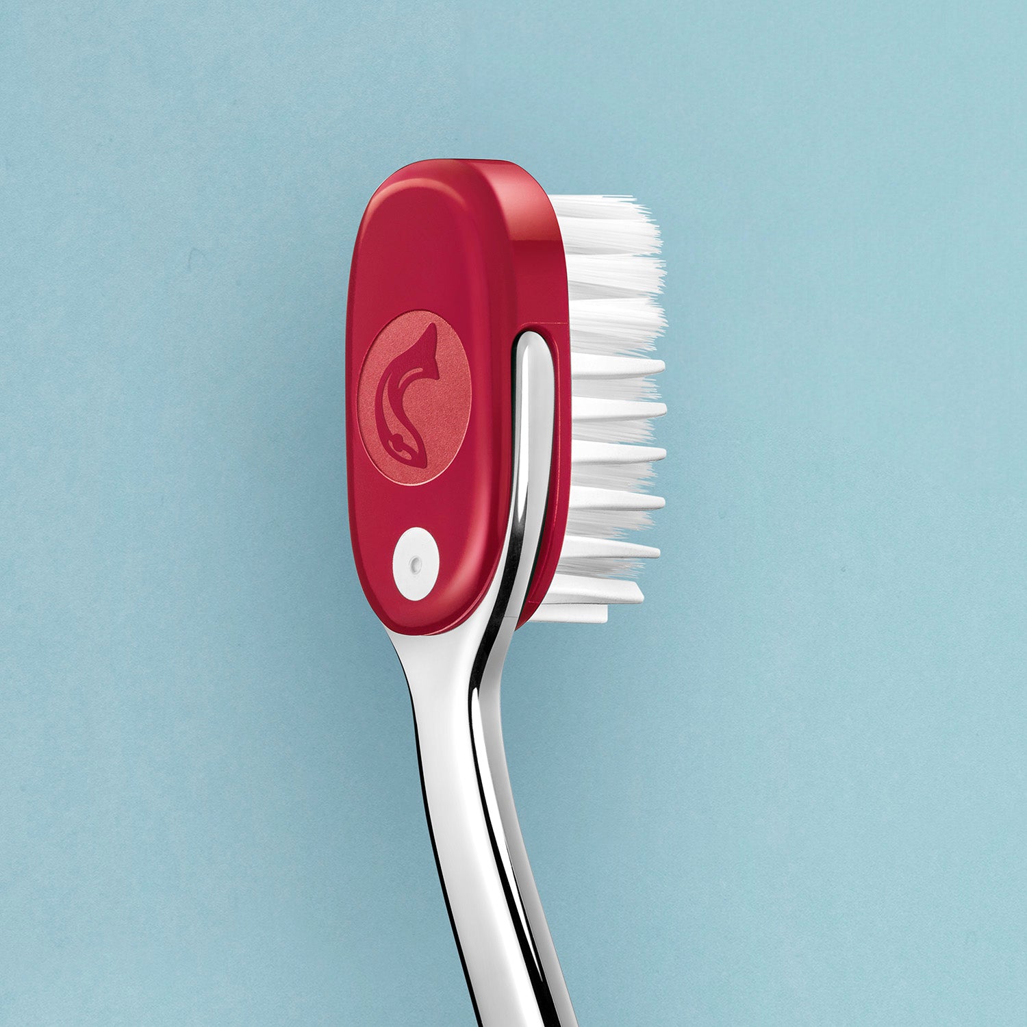 Le setole Berninox sono realizzate con materiale riciclato (rPBT) derivato da bottiglie in PET (56%). Abbiamo scelto queste setole perché sono allo stesso tempo morbide e durevoli, a differenza delle loro alternative ecologiche, fatte di olio di ricino, che si usurerebbero precocemente. Un anello esterno di setole in elastomero di grado medico aggiunge ulteriore morbidezza, ideale per le gengive sensibili, e contribuisce a ridurre le macchie sullo smalto.